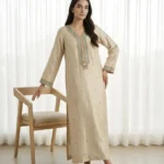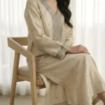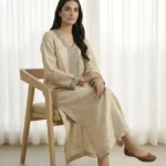 The kurti features fine resham embroidery on the neckline, sleeves, and overall surface. Moreover, this adds a refined look without heavy embellishment, making it a standout piece in our Formal Wear 2026 collection. The soft gold shade enhances the design, giving it a timeless appeal. Consequently, it is perfect for festive gatherings, evening wear, or anyone looking for the latest trends in luxury formal wear.